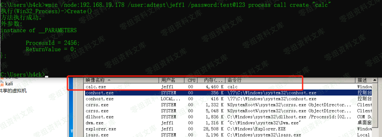 wmic /node:192.168.19.178 /user:adtest\jeff1 /password:test@123 process call create "calc" 缺点:无法回显命令