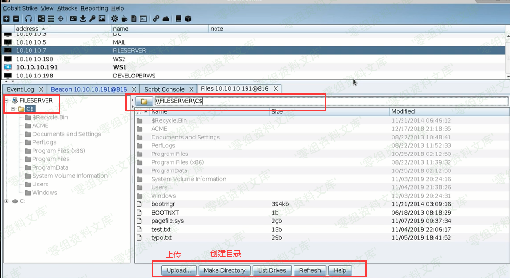 可以使用File Browser,通过输入UNC共享目录来上传文件。也可以使用命令上传:cd \\host\C$\windows\temp upload /path/file.exe