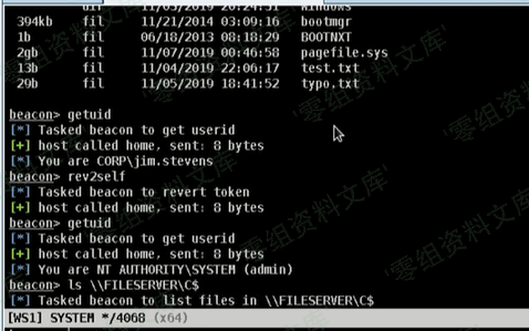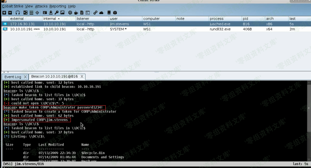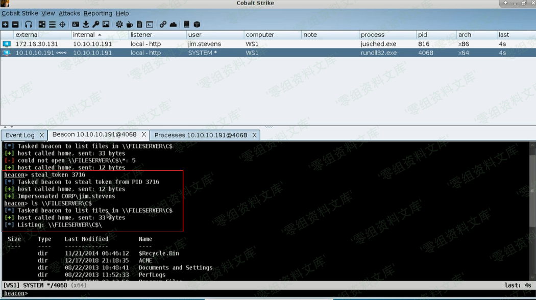 然后Beacon就会执行steal_token 3716,接着我们就有了这个jim.stevens的权限了