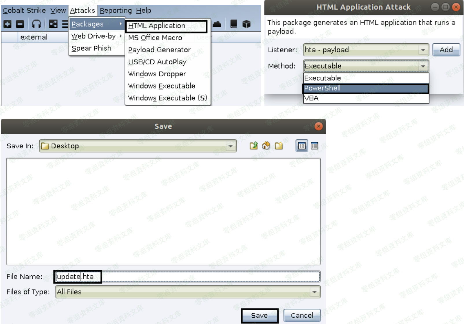 由于是网页挂马,所以此处我们就直接生成一个 hta 的 payload, "Method "选择用 "PowerShell" [ win7 之后的系统建议直接用"powershell"],默认的"Executable"是利用 vbs 执行 shellcode[这对于一些老系统也许还行,但对于 win7 之后的系统执行会有些问题] ,生成过程如下