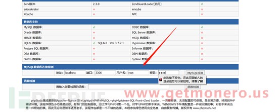 记住这个绝对路径,后面用得上,然后页面拉到最后,使用弱口令对MySQL数据库连接进行检测。一般phpstudy默认配置的mysql账号密码为root/root,直接使用这个去尝试登录。