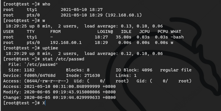 awk '/\$1|\$6/{print $1}' /etc/shadow #可以远程登录的账号 cat /etc/passwd | grep /bin/bash #查看哪些用户使用shell cat /etc/passwd | grep x:0 #查看哪些用户为root权限 cat /etc/passwd | grep -v nologin #查看除了不可登录以外的用户都有哪些,有没有新增的who #查看当前登录用户(tty 本地登陆 pts 远程登录) w #查看系统信息,想知道某一时刻用户的行为 uptime #查看登陆多久、多少用户,负载 stat /etc/passwd #查看密码文件上一次修改的时间