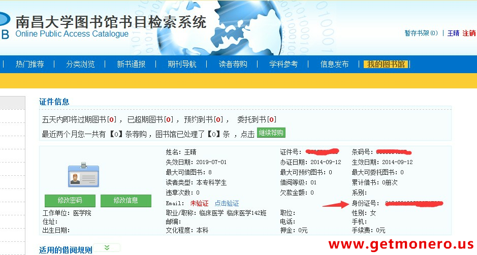这里利用学号和弱口令密码123456登录图书馆管理系统,成功拿到妹子的身份证